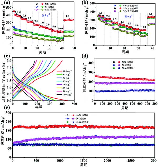 為了進(jìn)一步描述制成活性炭的電化學(xué)行為,進(jìn)行循環(huán)伏安法和恒電流充電放電測(cè)試。為了證明活性炭的優(yōu)點(diǎn),還在相同的質(zhì)量負(fù)載下測(cè)試了幾種活性炭的Na儲(chǔ)存性能,圖2a顯示了在0.05至10Ag-1的不同電流密度下測(cè)試5個(gè)循環(huán)。與其他兩個(gè)樣品相比,氮硫共摻雜活性炭顯示出優(yōu)異的速率性能,在高速測(cè)量之后仍然可以恢復(fù)高比容量。對(duì)于沒有S摻雜的活性炭,當(dāng)電流密度增加時(shí),電極提供的容量降低。相比之下,不同電流密度下的恒電流充電放電曲線進(jìn)一步證實(shí)了這些速率的結(jié)果。因此,氮硫共摻雜活性炭電極表現(xiàn)出比其他對(duì)照樣品好得多的速率性能和優(yōu)異的鈉儲(chǔ)存性能。