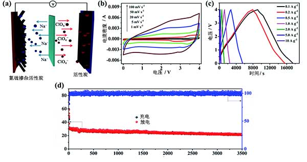 如圖3a所示,使用氮硫共摻雜活性炭作為陽(yáng)極并且商業(yè)活性炭作為陰極在電解質(zhì)溶液中構(gòu)建的鈉離子電容器裝置。在充電過(guò)程中,ClO 4-離子在活性炭的多孔結(jié)構(gòu)中被吸收,而來(lái)自電解質(zhì)的Na離子被插入到氮硫共摻雜活性炭中。放電過(guò)程與充電過(guò)程相反。在制造鈉離子電容器之前,氮硫共摻雜活性炭電極在預(yù)活化10個(gè)循環(huán)在Na離子半電池中獲得高效率,然后放電至0.01V的截止電壓。此外,研究了活性炭作為陰極的電化學(xué)性能,以評(píng)估陰極和陽(yáng)極之間的電荷平衡。活性炭的比表面積高達(dá)1500以上。根據(jù)活性炭陰極和氮硫共摻雜活性炭陽(yáng)極的比容量值,鈉離子電容器中氮與硫摻雜活性炭的質(zhì)量比為3:1。