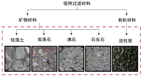在分析中使用活性炭和未經(jīng)修飾的礦物材料,例如沸石,石灰石砂,硅藻土和埃洛石(圖1)。礦物材料是不經(jīng)受預處理,以確保使用最經(jīng)濟上有利的材料。本期使用的活性炭是一種微孔材料,由微孔表面和體積值和相對較低的中孔表面值證明該材料的表面。硅藻土,沸石和埃洛石是中孔材料,因此其特征在于具有中間孔的平均比表面積,所述中孔具有不規(guī)則尺寸和形狀的窄裂縫形狀。在埃洛石中觀察到這些礦物中介孔的大比表面積和體積,而硅藻土的孔隙比較少,石灰石砂可歸類為無孔材料。