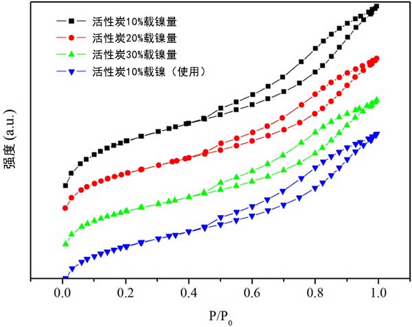為了研究活性炭載鎳催化劑的可重復(fù)使用性,首先在真空下過濾分離先前實(shí)驗(yàn)的廢活性炭,然后用丙酮徹底洗滌,接著用水洗滌多次。然后將過濾的活性炭在強(qiáng)制通風(fēng)烘箱中在110℃下干燥,然后在管式爐中在氮?dú)饬飨略?00℃下煅燒4小時(shí)。經(jīng)過從新活化的活性炭的測(cè)試,活性炭對(duì)硬脂酸的產(chǎn)率和選擇性轉(zhuǎn)化為十七烷在重復(fù)三次催化后性能幾乎沒有下降。選擇性保持在約90%,在無(wú)溶劑體系中保持穩(wěn)定;钚蕴康腘2吸附-脫附等溫線如圖3所示,表明隨著鎳負(fù)載量的增加,活性炭的表面積和孔體積減小,表明過量的鎳顆?赡茏枞欢康幕钚蕴靠撞p少孔體積。