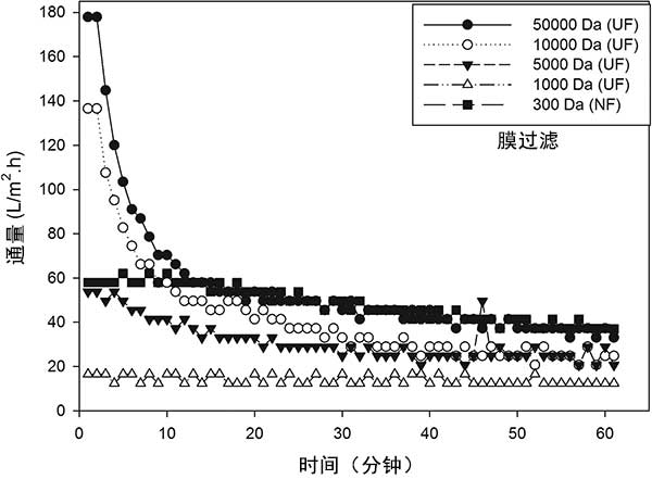 在膜過濾測試中,使用四個(gè)UF膜和一個(gè)NF膜。研究了1小時(shí)的通量變化,并監(jiān)測了降低的通量。在UF膜觀察到較高的通量降低。過濾1小時(shí)后,隨著截留分子量從50,000 Da減少到1,000 Da,通量下降也減少了。對于10,000 Da UF膜,在初始通量1小時(shí)過濾后損失了82%的通量。1,000 Da UF膜顯示出較低的通量在圖2顯示。孔徑是影響膜過濾通量的最重要參數(shù)之一,也是影響活性炭吸附能力的參數(shù)。通量也受膜結(jié)構(gòu),水中成分和廢水pH的影響。有些膜有很高的同量主要是由于膜表面與廢水成分之間的靜電相互作用。