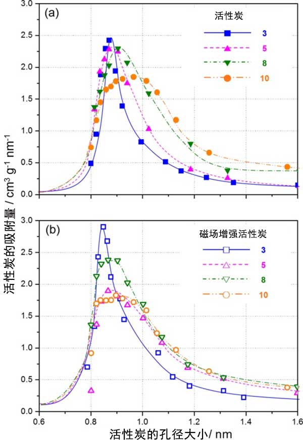 從煤焦油和瀝青制備活性炭的微孔分布,從所獲得的吸附等溫線,在圖3兩種活性炭的孔徑差異非常小相差不到0.04nm,并且在兩種情況下大多數(shù)孔分布在0.80和0.95nm之間。然而,觀察到由磁場增強(qiáng)過的活性炭吸附量在該區(qū)域中大大增加。從吸附等溫線可以估計(jì)0.8至0.95nm范圍內(nèi)的總吸附量約為1.25倍。當(dāng)活化劑量加大時(shí)兩種活性炭的孔徑分布均發(fā)生變化,產(chǎn)生了略大的孔隙結(jié)構(gòu)。