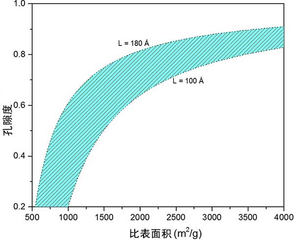 以前提出的活性炭微孔率模型將表面積和孔隙率作為兩個獨立變量處理。通過將石墨烯片的長度限制在100和180之間,并通過改變石墨中石墨烯層的平均數(shù)量,我們計算孔隙率和比表面積之間的關系。圖2顯示了孔隙率和表面積之間的關系。