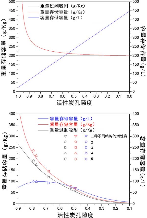 圖4顯示了兩種活性炭的重量和體積存儲容量之間的相互依賴性。實驗吸附測量與第二模型一致,將孔隙率和表面積作為因變量處理。經過對比活性炭樣品的實驗性過量吸附,重量儲存容量和體積儲存容量。圖3和圖4將理論模型與實驗數(shù)據(jù)進行比較。它表明,所開發(fā)的模型是通用的,并預測任何活性炭樣品的重量和體積儲存容量之間的相互依賴性。結果也適用于金屬有機骨架。雖然實驗結果比較好的活性炭不具有較高的表面積,但孔隙率在0.65和0.75之間。通過使用化學粘合劑將活性炭粉末壓縮成整料,實現(xiàn)了更高的體積儲存容量。整體的體積儲存容量使用整體式整體密度而不是活性炭的表觀密度或金屬有機框架材料的單晶密度來計算。