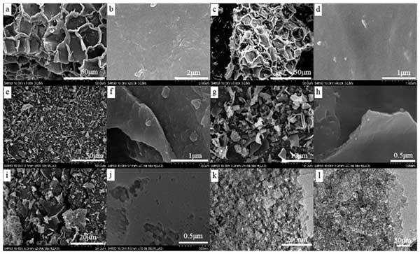 通過SEM和TEM研究了空氣氧化前后活性炭的微觀結(jié)構(gòu)(圖2)。在(圖2a,b)中,軟木材料呈蜂窩狀結(jié)構(gòu)并具有明顯的褶皺。在800℃碳化后,保留結(jié)構(gòu)并且包含該結(jié)構(gòu)的部分彼此緊密結(jié)合,看起來光滑(圖2c,d)。在350℃-450℃下空氣活化后,結(jié)構(gòu)單元被分離形成薄片(圖2e),這可歸因于細(xì)胞之間木質(zhì)素的降解;钚蕴砍尸F(xiàn)出層狀空氣氧化后的結(jié)構(gòu)(圖2的e-j)的。350℃和400℃活化的活性炭樣品表面相對光滑,在0.5-1μm的分辨率下未觀察到明顯的孔結(jié)構(gòu)(圖2f,h)。當(dāng)氧化溫度升至450℃時,活性炭的表面顯著變化并觀察到大量的孔。圖2j顯示450℃活化樣品顯示出具有裂縫和空隙的粗糙表面。TEM結(jié)果(圖2k,i)顯示450℃活化的活性炭具有三維(3D)互連框架的分級微/中孔結(jié)構(gòu)。這些孔可以有助于廢水中染料的吸附。