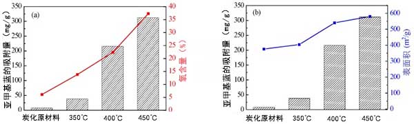 活性炭的空氣活化產(chǎn)生更多的分層孔結(jié)構(gòu),具有更高的表面積和更豐富的表面官能團。更多數(shù)量的孔納米結(jié)構(gòu)可為染料分子提供大量吸附位點并改善其吸附能力。富含表面的官能團可促進活性炭在水中的分散,使活性炭在吸附過程中與染料完全接觸。這些性質(zhì)在空氣活化后賦予活性炭較好的亞甲基藍吸附性。在300℃至450℃的溫度下空氣活化后,盡管由于350℃活化導(dǎo)致的表面積略微增,但吸附容量是炭化原料的4.8倍。這種情況表明,表面積在提高空氣活化后活性炭的吸附能力方面起著次要作用。表面性質(zhì)的變化可能主要影響空氣活化后活性炭的吸附性能。結(jié)果得到了亞甲基藍吸附容量與受空氣活化溫度影響的活性炭表面積和氧含量的相關(guān)性的支持(圖7)。亞甲基藍的改善的吸附性能與與活化溫度相關(guān)的氧含量的變化趨勢很好地對應(yīng)(圖7a)。而隨著活化溫度的升高,吸附容量的增長率遠高于表面積(圖4b)。
