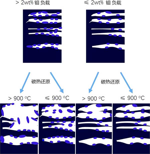圖4:具有不同鉬負(fù)載和碳熱還原溫度的活性炭的孔發(fā)展過(guò)程圖。