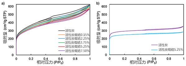 圖1:(a)化學(xué)活性炭在不同鋯負載之前和之后的-196℃下的氮吸附-解吸等溫線。(b)在鋯載荷為5.25%之前和之后的物理活性炭。