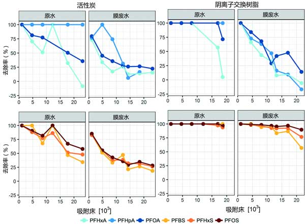 實(shí)驗(yàn)總計(jì)進(jìn)行了12周,每兩周取樣。這導(dǎo)致所有活性炭色譜柱的實(shí)驗(yàn)運(yùn)行時(shí)間為24個(gè),分別處理原水和膜廢水的陰離子交換樹脂色譜柱。在每次采樣之后每周對所有柱進(jìn)行反洗,以模擬典型的全尺寸操作。總共分析了15種全氟烷基物質(zhì),將吸附材料相對于全氟烷基物質(zhì)去除的性能與柱吸附模型的性能進(jìn)行了比較。