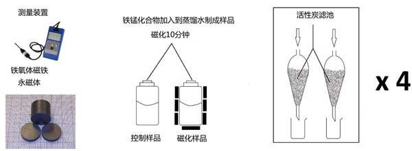 該實(shí)驗(yàn)在實(shí)驗(yàn)室規(guī)模上進(jìn)行,其中研究由八個(gè)分離漏斗組成。將各個(gè)分離漏斗成對(duì)分組并填充相同量的活性炭和其它吸附劑的過濾床。在每對(duì)分離漏斗中,一個(gè)用于對(duì)照樣品(不含磁性),而另一個(gè)用于磁化樣品。對(duì)照和磁化樣品分離漏斗中各個(gè)過濾材料的重量一樣。將鐵錳化合物加入到蒸餾水濃縮制備實(shí)驗(yàn)用的水溶液。對(duì)于磁化過程,使用永磁鐵氧體磁鐵進(jìn)行磁化。然后通過填充有活性炭和其它吸附劑的沉積物過濾溶液。未校正樣品的pH。pH的差異與添加單獨(dú)的金屬標(biāo)準(zhǔn)溶液有關(guān)。圖1顯示了制備用于過濾和過濾過程的模型水樣品的過程。