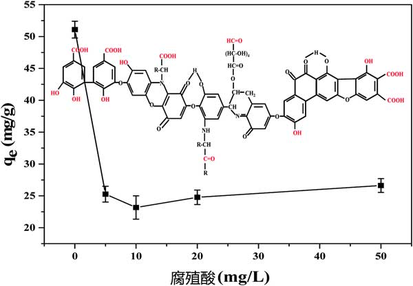 腐殖酸在通過死亡植物的微生物降解而衍生的天然水中普遍存在,其總是伴隨四溴雙酚A。因此,它的共存對四溴雙酚A的吸附效果是有影響的。根據(jù)四溴雙酚A在不同濃度腐殖酸下被活性炭吸附的結(jié)果(圖3),當(dāng)腐殖酸濃度小于10mg L-1時(shí),吸附容量顯著降低,而隨著腐殖酸濃度的持續(xù)增加,活性炭吸附四溴雙酚A增強(qiáng)。腐殖酸的基本結(jié)構(gòu)是芳香環(huán)和脂環(huán)環(huán),與羧基,羰基,醌基,羥基和甲氧基連接。所有這些結(jié)構(gòu)都可以形成π-π相互作用,與活性炭形成氫鍵,這可能是由于腐殖酸和四溴雙酚A在活性炭上的競爭性吸附,從而降低了四溴雙酚A的去除效率。高濃度腐殖酸吸附的輕微增加可能是由于游離四溴雙酚A吸附到吸附到活性炭表面的腐殖酸。