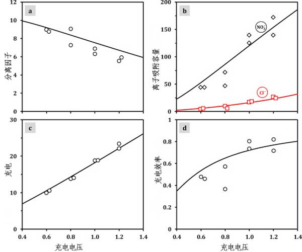 圖3a顯示了這一點(diǎn)分離因子隨充電電壓降低,但親和效應(yīng)不會減少很多,并且在高電壓下也繼續(xù)發(fā)揮重要作用。充電和離子吸附容量隨充電電壓的增加而增加。圖3d顯示充電效率遠(yuǎn)低于單位,這可以通過在充電步驟開始時(shí)從活性炭表面解吸共離子來解釋。