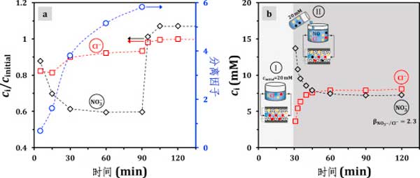 圖4a顯示了硝酸鹽濃度連續(xù)下降約30分鐘,直至達(dá)到恒定值,而氯化物濃度僅降低約15分鐘。此后,我們觀察到了增加氯化物溶液中的濃度,這意味著硝酸鹽離子逐漸取代氯化物離子。支持我們優(yōu)先吸附的研究結(jié)果硝酸鹽過度氯化物在平衡時(shí),我們還進(jìn)行了兩階段電吸附實(shí)驗(yàn)。我們觀察到了增加氯化物濃度,而硝酸鹽濃度降低。加入硝酸鹽后約15分鐘沒有3-,我們觀察到只有輕微的濃度變化。