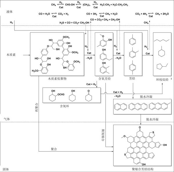 基于木質(zhì)素油的產(chǎn)物產(chǎn)率和組成,提出了一種用于加氫處理的反應(yīng)過程。木質(zhì)素使用活性炭催化劑和氫氣(圖3)。它涉及在液相和氣相中發(fā)生的許多連續(xù)和平行反應(yīng)。對低分子量烷基酚類和芳族化合物的所需反應(yīng)涉及通過裂解鍵來對木質(zhì)素進(jìn)行熱和催化解聚(加氫裂化)。最具反應(yīng)性的連接是醚鍵,盡管這些在木質(zhì)素中不是很豐富;钚蕴看呋瘎┐龠M(jìn)解聚反應(yīng),但在不存在活性炭催化劑的情況下的反應(yīng)也產(chǎn)生(有限)量的木質(zhì)素油,表明熱解聚反應(yīng)也起作用。低聚物片段可以進(jìn)一步解聚成烷基酚類形式的低分子量化合物或再聚合(也與已形成的低分子量化合物一起)成更高濃度的結(jié)構(gòu),最終導(dǎo)致燒焦。后一種途徑可能是熱反應(yīng),因此可以通過使用非常活潑的活性炭催化劑來抑制,所述催化劑通過催化隨后的轉(zhuǎn)化來減少活性中間體的量。中間低分子量烷基酚類在反應(yīng)條件下不是惰性的,并且可以進(jìn)一步加氫脫氧成芳族化合物和烷烴。