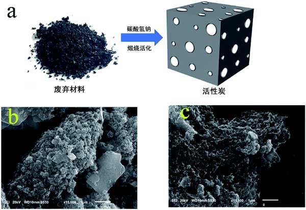 圖1 :(a)是活性炭合成的示意圖。(b和c)活性炭和炭1.5的SEM圖像。