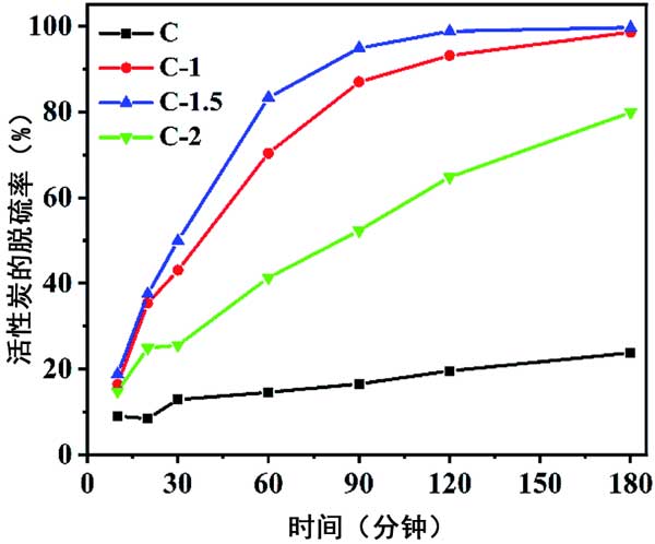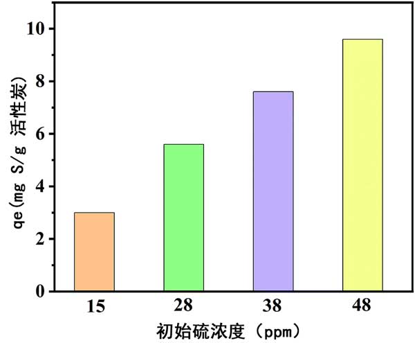 基于以上結(jié)構(gòu)表征和實驗結(jié)果,得出了吸附機理。戊硫醇分子中的強路易斯酸S原子與活性炭中來自氧原子的一對電子相互作用。大孔和中孔的存在有助于活性炭的比表面積增加,暴露出更多的內(nèi)部原子,并促進了質(zhì)量傳遞,從而使吸附劑易于與硫化物接觸。關(guān)于炭1.5的工業(yè)應用前景,考慮了硫的初始濃度對吸附性能的影響。如圖3所示,對于初始含硫量分別為15、28、38和48 ppm的模型燃料,炭1.5的平衡吸附容量為每克吸附劑3.0、5.6、7.6和9.6 mgS。值得注意的是,在此濃度范圍內(nèi),吸附劑的硫去除率高于97%。這組結(jié)果表明該材料對于去除低濃度的硫化物具有明顯的工業(yè)應用價值。