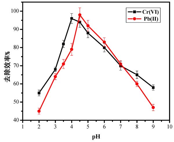 pH的影響:系統(tǒng)的吸附效率在很大程度上取決于溶液的pH值。圖2中顯示的數(shù)據(jù)突出顯示了pH值對Pb(II)和Cr(VI)離子在活性炭上的吸附的影響。在pH 4.6和4下,Pb(II)和Cr(VI)的吸附增加并達到最大值。pH值高于6時,吸附活性降低。這可以歸因于游離離子的減少是由于在較高的pH范圍內(nèi)形成羥基配合物,金屬離子隨后沉淀。因此,去除效率急劇下降。另一方面,在低于合適pH的pH值下,H+和金屬離子爭奪活性炭表面上相同活性位點上的相同活性位點可能會阻礙吸附活性。