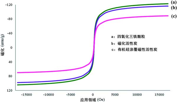 在這項(xiàng)研究中使用VSM來檢查合成活性炭的磁強(qiáng)度。對(duì)Fe 3 O 4顆粒,磁性活性炭和機(jī)硅涂覆磁性活性炭進(jìn)行了研究,以研究它們?cè)谕扛矔r(shí)的磁強(qiáng)度趨勢(shì)。幾種材料的磁滯回線分別示于圖1(a)-(c)。根據(jù)獲得的結(jié)果。由于存在非磁性活性炭和有機(jī)硅表面活性劑涂層,磁強(qiáng)度似乎下降了。這確認(rèn)涂覆過程成功。但是,盡管在涂覆最終材料機(jī)硅涂覆磁性活性炭時(shí)磁化強(qiáng)度降低,但其磁強(qiáng)度仍在可接受的范圍內(nèi),并且強(qiáng)度足以在吸附過程中進(jìn)行。