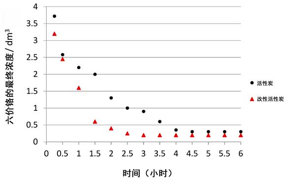 從獲得的測試結(jié)果可以得出結(jié)論,吸附時間對特定碳的鉻(VI)去除效率具有顯著影響。鉻酸根離子相對于活性炭的最大還原發(fā)生在4.5小時后。在硝酸改性活性炭上去除鉻的速率更高,并且在2.5 h后發(fā)生了吸附平衡時間。然后進(jìn)行穩(wěn)定化處理,并進(jìn)行進(jìn)一步測試(確定等溫線),發(fā)現(xiàn)該接觸時間為不同的活性炭通常不超過6小時。
