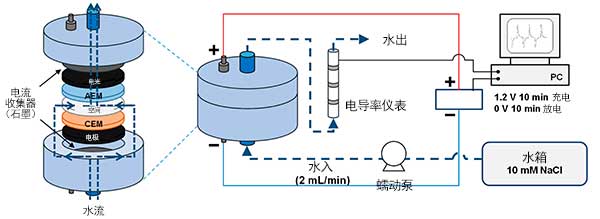 方案1中描述了用于檢查脫鹽性能的膜電容去離子系統(tǒng)。每個(gè)電極由作為集電器的石墨,交流電極和IEM組成。將陰離子交換膜和陽(yáng)離子交換膜分別放在陽(yáng)極和陰極上。一對(duì)電極由厚度為110 µm的尼龍墊片隔開(kāi)。使用蠕動(dòng)泵將進(jìn)料水供應(yīng)到電解池。處理后的溶液直接流過(guò)電導(dǎo)率儀,隨后使用單程模式。除了IEM的存在外,還以與電容去離子中使用的相同配置進(jìn)行了CDI實(shí)驗(yàn)。使用電池循環(huán)器在1點(diǎn)分別施加電壓10分鐘。在充電步驟中為2 V,在放電步驟中為0V。從第三個(gè)循環(huán)獲得數(shù)據(jù),并從至少三個(gè)操作中計(jì)算出平均值,以實(shí)現(xiàn)可重復(fù)性。