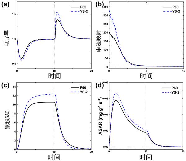 圖2以(a)歸一化電導(dǎo)率曲線表示使用疏水和親水活性炭電極的電容去離子性能。如圖2a所示,在充電步驟期間,與疏水活性炭電極相比,歸一化電導(dǎo)率在親水活性炭電極的情況下顯示出更低和更寬的下降。對(duì)于親水活性炭電極,在充電步驟開(kāi)始時(shí),圖2b中所示的特定電流也顯得較高。圖2的a,b在電容去離子表明更多離子在充電步驟中的初始幾分鐘吸附在親水活性炭電極的表面上。這意味著在親水活性炭電極上可以更快,更高地吸附鹽?梢酝茢,由于水分子更容易進(jìn)入微孔,因此親水活性炭電極上離子的可及表面積大于疏水活性炭電極上的離子的可及表面積。