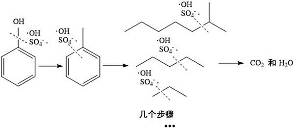 圖4顯示了苯酚的降解過(guò)程。首先破壞連接苯酚中羥基的化學(xué)鍵,然后打開苯環(huán)以形成通過(guò)單鍵連接的單鏈。隨著反應(yīng)的進(jìn)行,單鏈之間的化學(xué)鍵被破壞,并形成具有較少碳原子數(shù)的單鏈。將鏈重組為新的長(zhǎng)鏈的過(guò)程是由于氧化劑劑量不足。然而,隨著反應(yīng)的進(jìn)行,諸如這些短鏈和新形成的長(zhǎng)鏈的中間體被進(jìn)一步降解。在此過(guò)程中,一些單鏈會(huì)隨著反應(yīng)時(shí)間的增加而重組形成一條更長(zhǎng)的新單鏈。隨著這一過(guò)程的繼續(xù),長(zhǎng)單鏈逐漸分解成短鏈,然后苯酚礦化成二氧化碳和水。