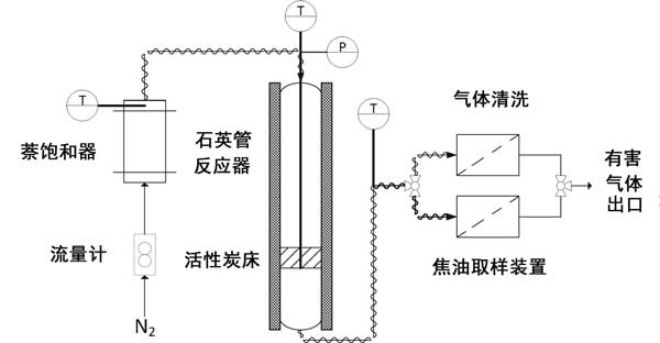 萘轉(zhuǎn)化試驗已在圖1所示的實驗設(shè)備中進行,該設(shè)備顯示了其主要部分:進料系統(tǒng),反應(yīng)器,采樣/清潔裝置和氣體分析儀。進料系統(tǒng)由用于調(diào)節(jié)氮氣流量的轉(zhuǎn)子流量計和萘飽和器組成,以獲取摻有焦油的物流。飽和器和反應(yīng)器之間的管道應(yīng)保持在150°C以上,以免萘發(fā)生冷凝。所使用的反應(yīng)器是內(nèi)徑為14 mm,總高度為600 mm的立式管狀石英反應(yīng)器。將活性炭床放在反應(yīng)器內(nèi)部的玻璃粉上方,該玻璃粉位于距頂部430毫米處。床的溫度通過K型熱電偶在床的中央進行測定。在焦油采樣期間,通過切換三通閥,將反應(yīng)器出口處的氣體導(dǎo)入采樣裝置,并在其余時間內(nèi)導(dǎo)入清潔裝置。采樣裝置由三個撞擊器組成,在0°C時充滿異丙醇。專用實驗表明,在本研究分析的條件下,該設(shè)備的捕獲效率超過99%。借助帶有熱導(dǎo)檢測器(TCD)的微型氣相色譜儀分析清潔區(qū)出口處的氣體,以在線測定短鏈烴(從乙炔到苯)和分子氫。實驗裝置的更多詳細信息可以在其他地方找到。