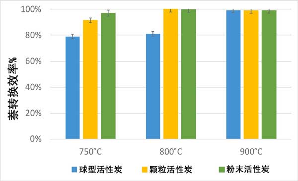 圖2:用活性炭球型、顆粒和粉末在750°C,800°C,900°C下獲得的萘轉(zhuǎn)化率以百分比表示,并帶有標準偏差的表示。