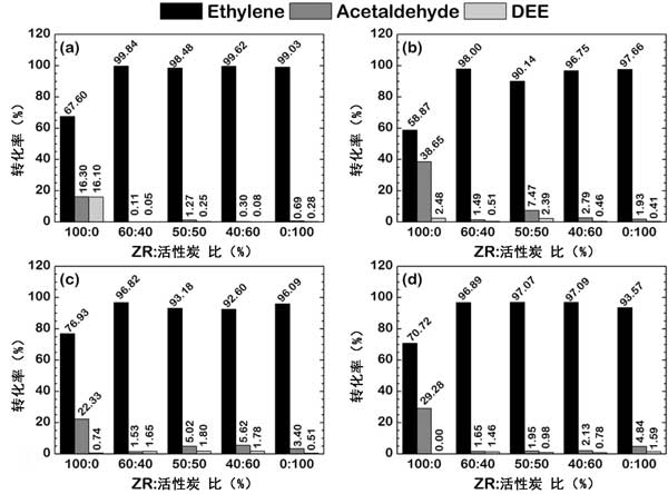 因此,提到在包含高達(dá)50wt%的活性炭的雙載體體系中發(fā)現(xiàn)的乙烯回收率的提高是由于來自活性炭的碳原子對(duì)催化劑的電子作用。另外,由于通過焦化的失活,大量的活性炭將導(dǎo)致乙烯回收率的降低,這是在高溫下與含碳反應(yīng)物的反應(yīng)中發(fā)現(xiàn)的常見的失活方案。這種失活導(dǎo)致活性位點(diǎn)的阻塞,降低了活性位點(diǎn)的數(shù)量,導(dǎo)致催化劑的總轉(zhuǎn)化率降低。
