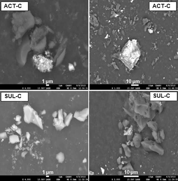 圖1:活性炭(ACT-C)和磺化活性炭(SUL-C)催化劑的SEM圖像。