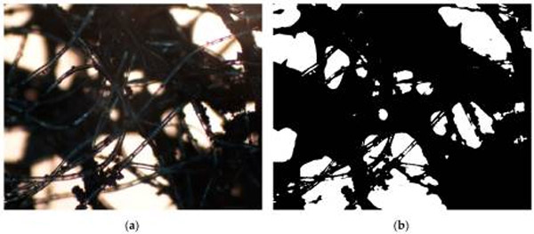 圖1:活性炭負(fù)載非織造布樣品的原始光學(xué)顯微鏡圖像(a)和灰度表示(b)。