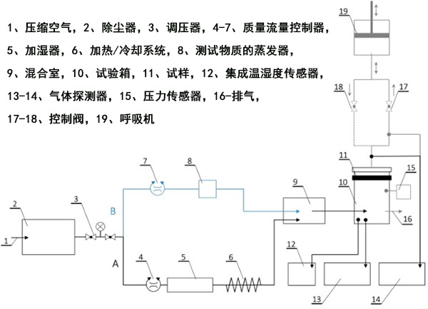 在測試過程中,干燥的壓縮空氣通過裝有減壓器的顆粒過濾器輸送到系統(tǒng)中,該壓力過濾器的調(diào)節(jié)范圍為0-8 bar。然后將其分為兩條線(圖2):用于溫度和相對濕度調(diào)節(jié)的線A和用于調(diào)節(jié)測試室內(nèi)測試物質(zhì)濃度的線B。將來自管線A的給定溫度和相對濕度的空氣與來自管線B的激發(fā)蒸汽在混合室中混合,然后將活性炭鎖定在直徑為11.3的氣動樣品架中,并將其引入測試室。另外,在脈動流測試期間使用了連接到測試室出口的呼吸機(jī)。呼吸機(jī)設(shè)定為25個循環(huán)/分鐘和2 L/沖程,這對應(yīng)于每分鐘25吸氣和25呼氣,呼吸量為2L。呼吸機(jī)的氣流模式為正弦曲線。脈動流量測試期間的挑戰(zhàn)濃度得到補(bǔ)償,以確保將總負(fù)載標(biāo)準(zhǔn)化為穩(wěn)態(tài)流量條件。實(shí)驗(yàn)以四個變體進(jìn)行,每個變體評估不同因素(即挑戰(zhàn)濃度,相對濕度,挑戰(zhàn)流速,挑戰(zhàn)流型)對活性炭復(fù)合材料吸附特性的影響。