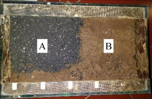 這項(xiàng)研究是在小型土壤上進(jìn)行的,然后將其注入含有重金屬的礦山廢料中。使用27.5厘米x10厘米x20厘米的水族箱制作土壤模型,每5厘米要釘一次。該釘塞提供了空間,并使重金屬?gòu)U物更容易吸收到土壤中。每天注入多達(dá)5毫升的重金屬?gòu)U物,直到其積累多達(dá)200毫升。然后將土壤模型分為兩個(gè)區(qū)域:區(qū)域A和區(qū)域B。區(qū)域A的表層土壤被施加了活性炭,而區(qū)域B被留下(圖2和圖3)。每天都用蒸餾水稀釋微型土壤,以保持土壤濕度。