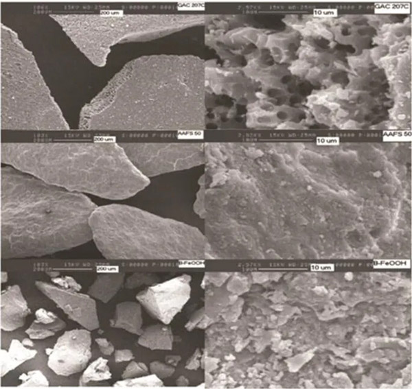 圖2顯示了吸附劑的SEM圖像;钚蕴烤Я5乃毫堰吘壱诧@示出內(nèi)部“孔”。其內(nèi)部結(jié)構(gòu)可以被認(rèn)為是碳板的石墨型分層;罨^(guò)程中產(chǎn)生的孔隙和大量碎屑導(dǎo)致了這種吸附劑的易碎性。AAFS晶粒顯示出相同的傾斜形狀,表面看起來(lái)光滑且具有均勻的涂層。在更大的范圍內(nèi),僅可見(jiàn)很少的裂縫或孔洞,這表明表面積主要在外部。β-FeOOH的表面具有高脆性,因此表面光滑且?guī)в写罅克樾肌6嗫捉Y(jié)構(gòu)與SEM照片非常吻合(圖2),說(shuō)明了活性炭的片狀結(jié)構(gòu)及其眾多的空洞,而鐵化合物則顯得光滑,只有很少的裂紋;罨^(guò)程中產(chǎn)生的孔隙和大量碎屑導(dǎo)致了這種吸附劑的易碎性。考慮規(guī)模,中孔和大孔上看到照片(尺寸以上2.5 μ M)。β-FeOOH的表面易碎,因此表面光滑,帶有大量碎屑。該刻度不允許人們區(qū)分赤霞石微晶(FeOOH的β形式)的特征桿雪茄形狀。