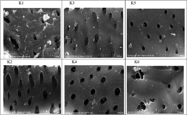 對(duì)原始活性炭(圖3中的K1)的掃描顯示出相當(dāng)均勻的孔;钚蕴康慕Y(jié)構(gòu)可以看作是薄片,為不規(guī)則分布和各種尺寸的孔提供了較大的吸附面積。表面上的大多數(shù)可見孔都在5微米范圍內(nèi),這與對(duì)椰殼活性炭的預(yù)期一致,而在這5微米孔內(nèi)可以看到小于1微米的較小孔。圖3中的K2顯示了在氯酸鹽吸附到表面活性部位后活性炭表面的變化。這些孔有變化的跡象,因?yàn)槠渲幸恍┪铰人猁},而其他孔被氯酸鹽和氯化物分子阻塞。在10,000倍的放大倍率下,可以觀察到小孔周圍和大孔入口處的沉積,因?yàn)轭A(yù)計(jì)表面活性基團(tuán)會(huì)大量存在于這些區(qū)域;钚蕴康乃嵝栽偕鷺O有可能形成了表面活性部位,從而增強(qiáng)了活性炭吸附大量氯酸鹽的能力。
