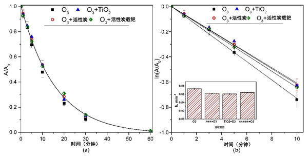 圖2:使用三種類型的催化劑(a)和擬除色率(b)進(jìn)行臭氧氧化和催化臭氧氧化處理期間的原始(未經(jīng)預(yù)處理)工業(yè)廢水。