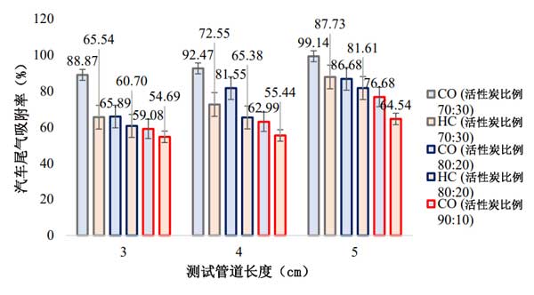 另外,隨著管的長度增加而增加,并導致活性炭的活性芯增加。吸附容量與活性炭的質(zhì)量成正比,因此可以吸收氣體的吸附劑分子也會增加。因此,吸附管中的長度變化對降低CO和HC濃度有影響。從圖3中可以看出,CO氣體的吸附百分比大于HC氣體的百分比。這是由于活性炭在CO和HC之間的吸附方式的變化;钚蕴课侥J绞芏喾N因素影響,包括活性炭分子在吸收污染物分子中的選擇性(親和力),溫度,壓力和氣體分子的大小。HC的分子結構比CO更復雜。因此,HC的分子大小將比CO大。因此,活性炭吸附的HC小于活性炭吸附的CO。