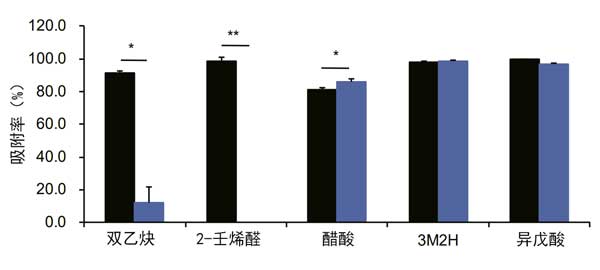 圖2: 活性炭和氧化鋅對異味揮發(fā)性有機化合物的吸附能力。黑色和藍(lán)色條分別表示活性炭和氧化鋅。