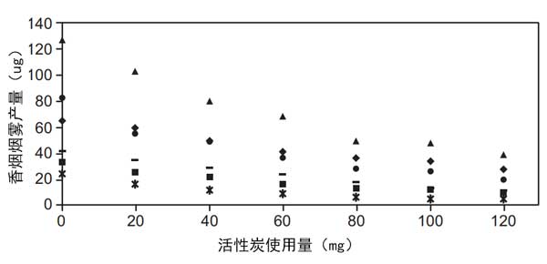 測試過程中我們在無炭和以20毫克至120毫克的六種重量增量添加活性炭來測試香煙。桿端和嘴端的醋酸纖維素長度段始終保持恒定。最大的空腔填充值用于所有負(fù)載,因此,總的過濾器長度增加了約50%。每使用15毫克活性炭增加1毫米。如前所述,所有香煙都在35/2/60的條件下進(jìn)行調(diào)理和抽煙。每個(gè)濾嘴負(fù)載量高為120mg時(shí)添加活性炭對焦油和尼古丁的收率(即顆粒相)的影響很小,這可能是由于較長的濾嘴導(dǎo)致了額外的機(jī)械過濾。對于所有測得的蒸氣,隨著活性炭載量的增加,產(chǎn)率都有所下降。這在圖1中以圖形方式顯示(僅出于清晰目的使用一定范圍的蒸氣),其中乙醛/丙酮值乘以0.1以進(jìn)行縮放。