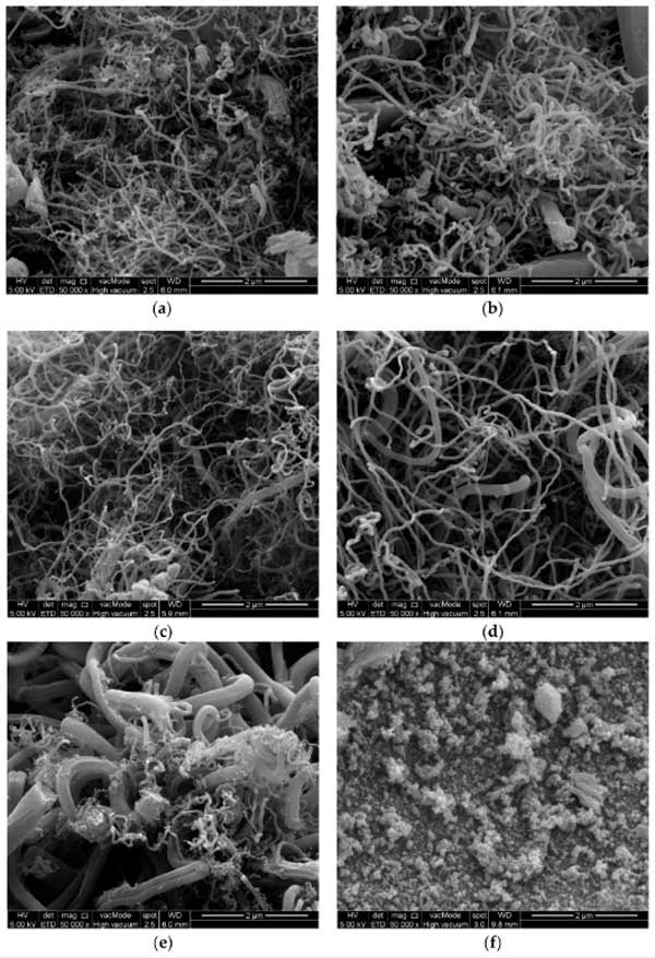 用FESEM技術(shù)分析了合成樣品的形態(tài)特征。圖2a-f顯示了放大的50,000倍的六個選定活性炭樣品圖像。圖2c顯示了活性炭5的FESM圖像,通過使用5%的鐵作為單催化劑和40分鐘的反應(yīng)時間,發(fā)現(xiàn)炭產(chǎn)率和接觸角較高。在此樣本中發(fā)現(xiàn)了兩種類型的碳納米材料,分別是碳納米纖維和多壁碳納米管。圖2f顯示了活性炭3的FESEM圖像,該圖像是通過使用4%的鈷作為單催化劑和40分鐘的反應(yīng)時間制備的。發(fā)現(xiàn)僅使用大量的鈷作為催化劑產(chǎn)生非常差的炭產(chǎn)率,這表明材料制備得不怎么好。圖2e顯示了活性炭4的FESEM圖像,該圖像是通過使用5%的鐵和4%的鈷作為雙金屬催化劑制備的,反應(yīng)時間為40分鐘。該圖像表明,使用大量的鈷和鐵時,主要生成聚集的炭納米材料和碳納米纖維,因為這樣的實驗條件不是優(yōu)選的。